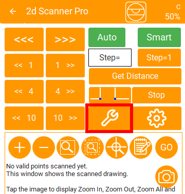 Tapping this button will put 2Dscanner in permanent rotation at the maximum speed. You can use this in order to check the path of the laser.