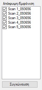 Σε αυτό το παράθυρο μπορείτε να δείτε πόσες σαρώσεις υπάρχουν στα γραφικά. Κάθε σάρωση αποτελεί ένα ενιαίο μπλοκ πληροφοριών και η ποσότητά τους εξαρτάται από το πόσες συγχωνευμένες σαρώσεις έχουν δημιουργηθεί στην εφαρμογή για κινητά (με την εντολή “Επόμενη σάρωση”) και από το πόσα αρχεία έχουν εισαχθεί στον επεξεργαστή. Κάθε σάρωση έχει διαφορετικό όνομα που δημιουργείται αυτόματα με βάση την ημέρα και την ώρα δημιουργίας της, για να αποφεύγονται οι συγκρούσεις στη μετέπειτα διαχείριση CAD.