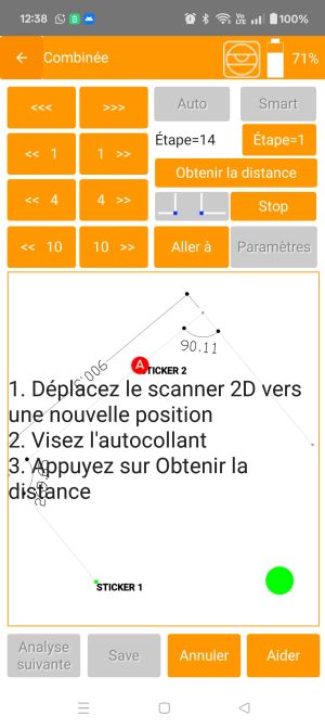 7. Une fois que vous visez l’autocollant, appuyez sur Obtenir la distance. 2Dscanner commencera à scanner la nouvelle ligne sur toute sa longueur pour une meilleure précision. Le pas est défini par défaut à