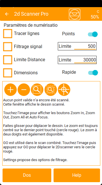 Les paramètres de cet écran permettent à l’utilisateur de filtrer les mesures afin d’obtenir un dessin agréable. Ces filtres n’affectent que la fenêtre de dessin et la génération DXF. Le fichier TXT contiendra toujours toutes les données. Si vous manquez un point en raison de mauvais réglages, vous pouvez toujours le retrouver en utilisant l’éditeur sur un PC Windows.