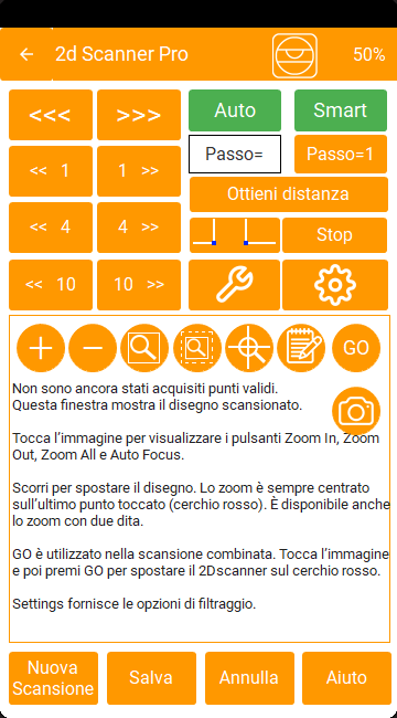 I pulsanti in alto a sinistra servono per lo spostamento permanente. Quando si preme questo pulsante, 2dscanner inizia a ruotare finché non viene rilasciato. La rotazione di 2dscanner avviene sempre nel rispetto di determinate impostazioni di accelerazione e decelerazione. In questo modo si fermerà senza problemi e tornerà nella posizione esatta in cui si trovava il punto quando è stato rilasciato il pulsante. Questo è stato implementato per evitare l’inclinazione anche se si utilizza un treppiede leggero. La conservazione della posizione iniziale è molto importante per ottenere una misura di qualità.