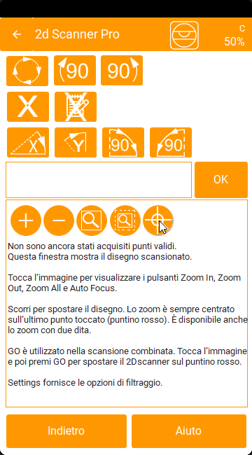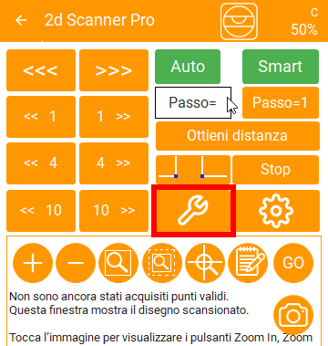 Toccando questo pulsante metterai 2Dscanner in rotazione permanente alla massima velocità. Puoi usarlo per controllare il percorso del laser.